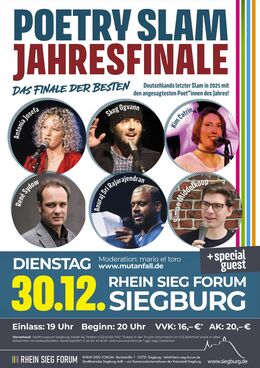 Wenn sich das Jahr dem Ende zuneigt und Worte zu Funken werden, ist es wieder Zeit für das große Finale der Bühnenpoesie: Am 30. Dezember 2025 lädt mario el toro zur 9. Ausgabe des „Best of Poetry Slam – Jahresfinals“ ins Rhein Sieg Forum Siegburg ein. Hier trifft Sprachkunst auf Gänsehaut, Humor auf Tiefgang und Bühnencharisma auf pure Emotion – ein literarischer Jahresausklang, den man nicht verpassen darf.